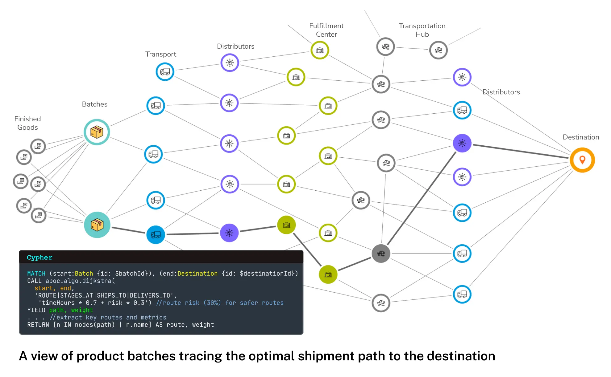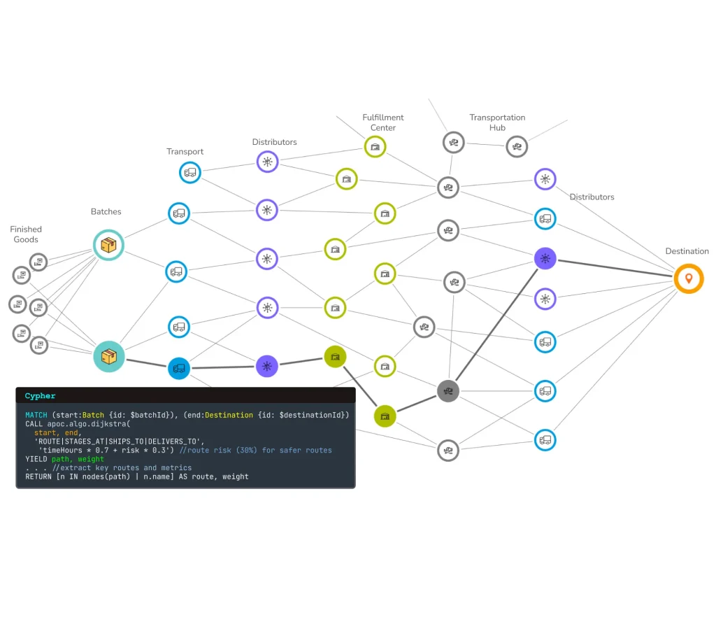 Avoid congested ports and vulnerable suppliers. Use Cypher and graph algorithms to identify faster, lower-risk routes. Simulate disruptions and create fallback options to stay ahead of crises.