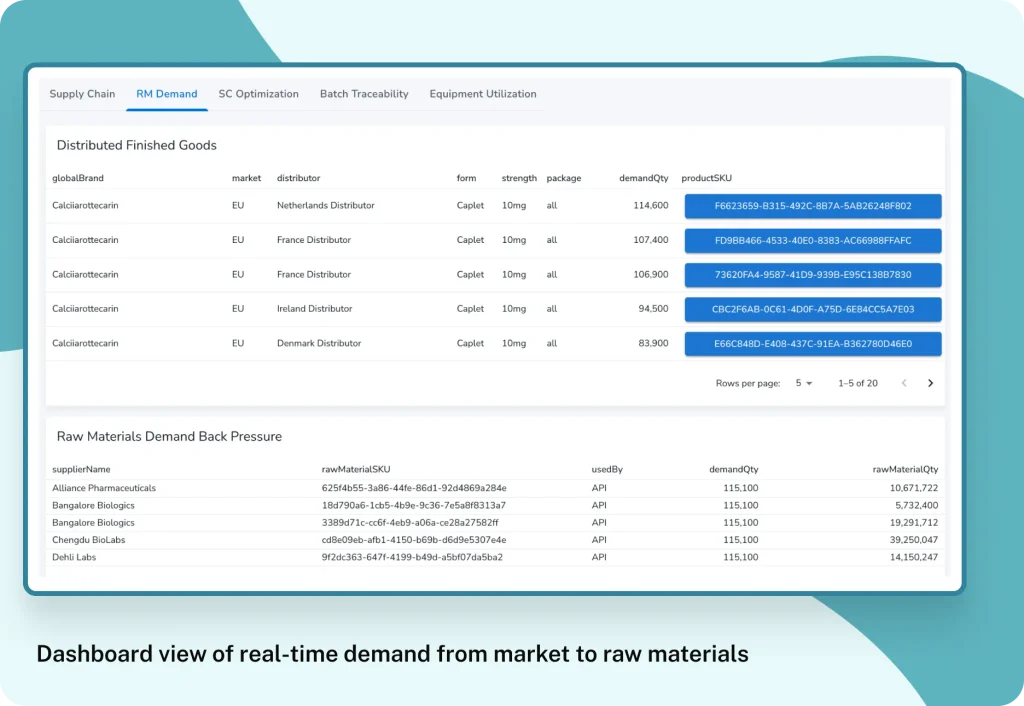 Gain end-to-end visibility across your supply chain —from suppliers to raw materials, production to batches, or orders to delivery. Trace dependencies, detect delays, and assess risks in real time to resolve issues faster, ensure service levels, and keep operations running smoothly.