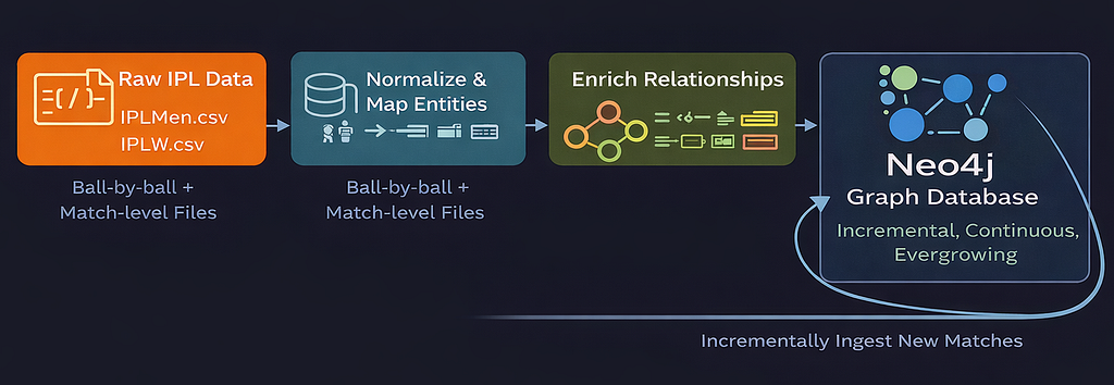 Importantly, the ingestion pipeline is designed to be incremental and repeatable. As new IPL matches are played and fresh data becomes available, the pipeline can be rerun to seamlessly integrate new seasons, matches, and deliveries into the existing graph without reprocessing historical data. This makes Boundary Graph future-ready — capable of evolving continuously as the tournament unfolds. Check out the data import script here.