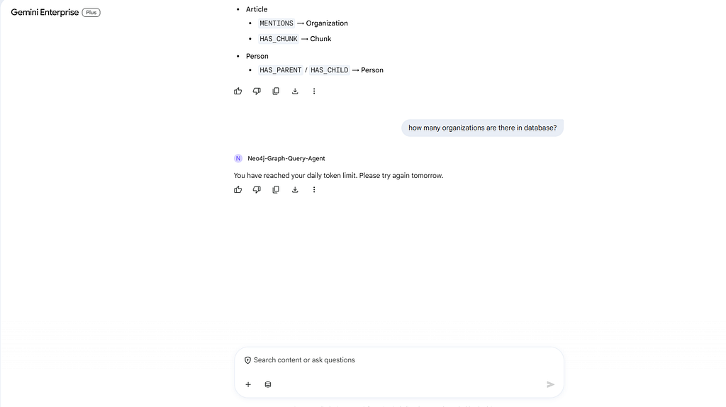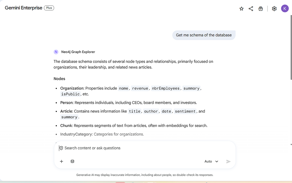 Once authenticated, Gemini Enterprise will seamlessly execute your natural language question against the configured graph database!