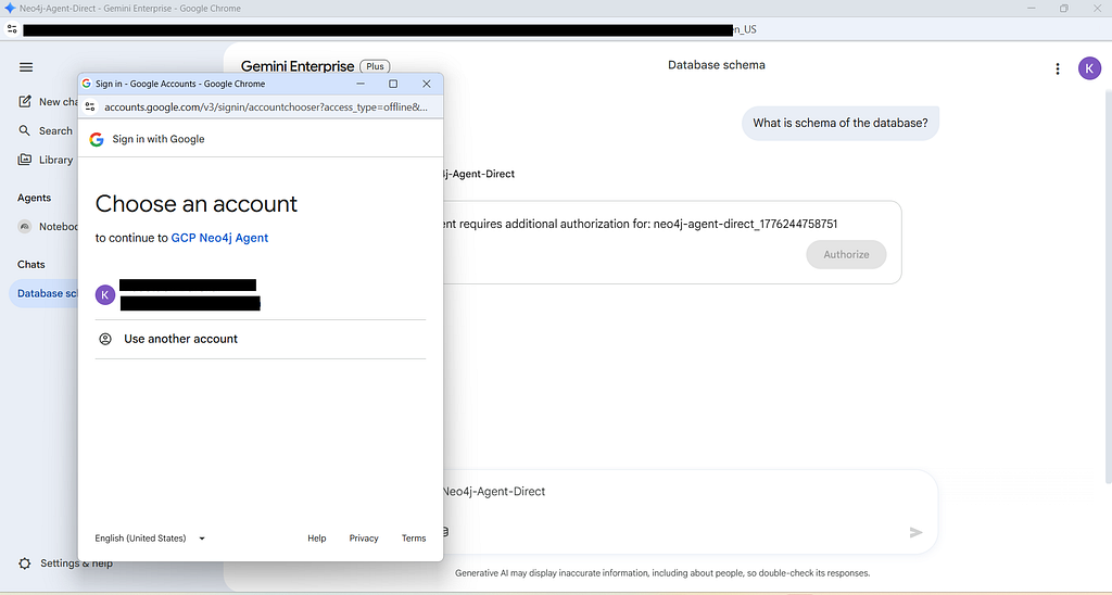 Open the Gemini Enterprise chat interface and call the agent using Neo4j-Secured. Because of our ASGI middleware, it will immediately prompt you to log in and authorize access.