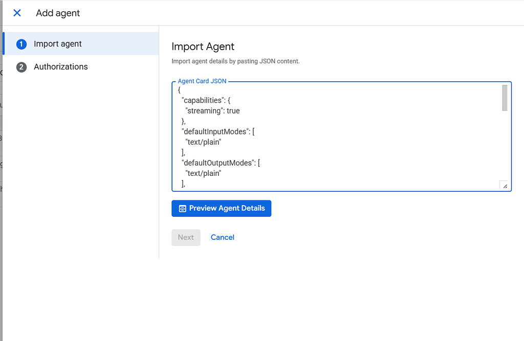 - Navigate to Agents > Add Agents > Custom agent via A2A.