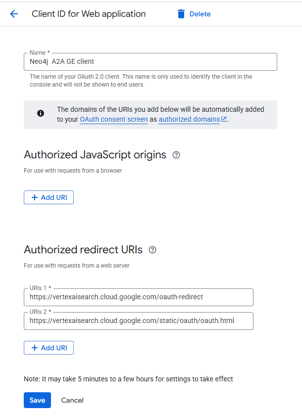- In the Google Cloud Console, create OAuth 2.0 Client credentials for a Web Application.