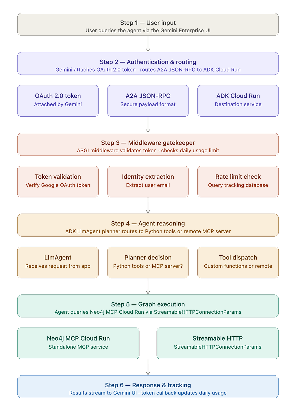 This guide outlines the architecture and deployment steps for building a production-ready, custom Neo4j Graph Database Agent integrated directly into Google Gemini Enterprise. By leveraging the Model Context Protocol (MCP), the Google Agent Development Kit (ADK), and the Agent-to-Agent (A2A) protocol, we can build a system that is fully decoupled and highly scalable.