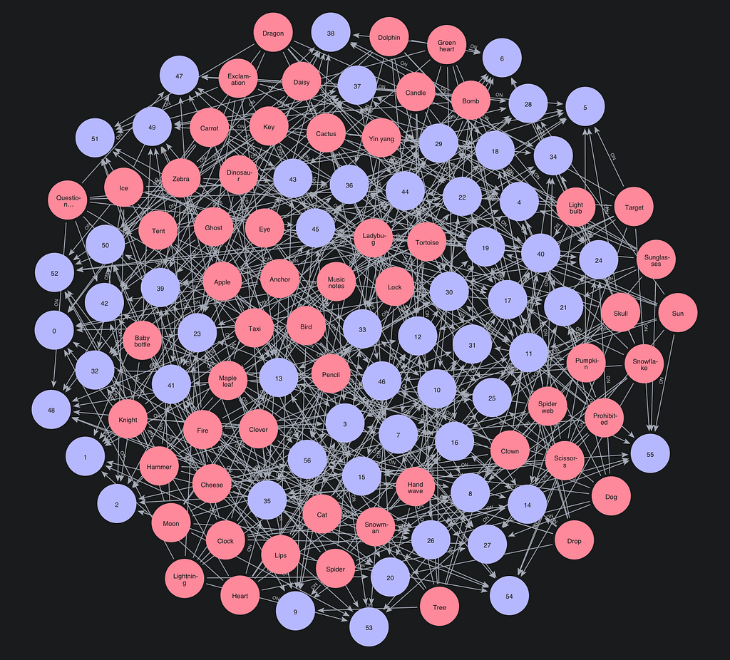 The graph, on the other hand, will never be wrong. It can’t be. Every question and answer possible is already materialized. Answers are generated by speedily following graph edges like pointers instead of “magical” transformer processes requiring a GPU. A well-specified query filters down to the inevitable truth — in this case, that any two cards have exactly one shared symbol.