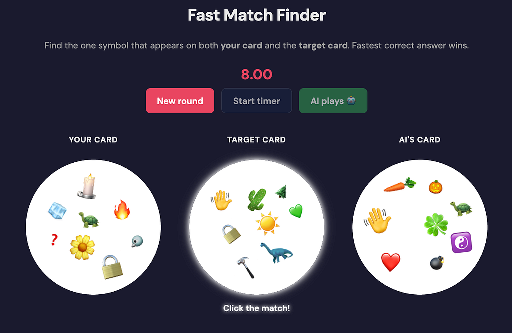 At this point, I though I would input all 57 of my cards into a graph so I would have an actual digital twin of my physical deck (might still do that), but I decided to try something else first — I vibe coded my own match game where I could test my speed or battle an AI model.