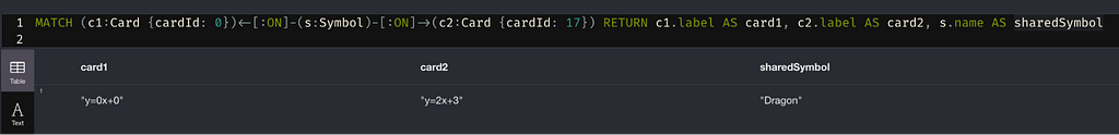MATCH (c1:Card {cardId: 0})<-[:ON]-(s:Symbol)-[:ON]->(c2:Card {cardId: 17})