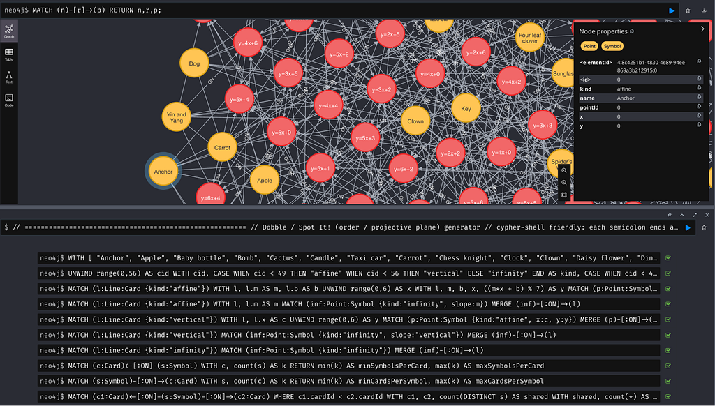 Using Neo4j and Cypher, we can construct the full projective plane and use symbol names consistent with my physical Dobble deck: