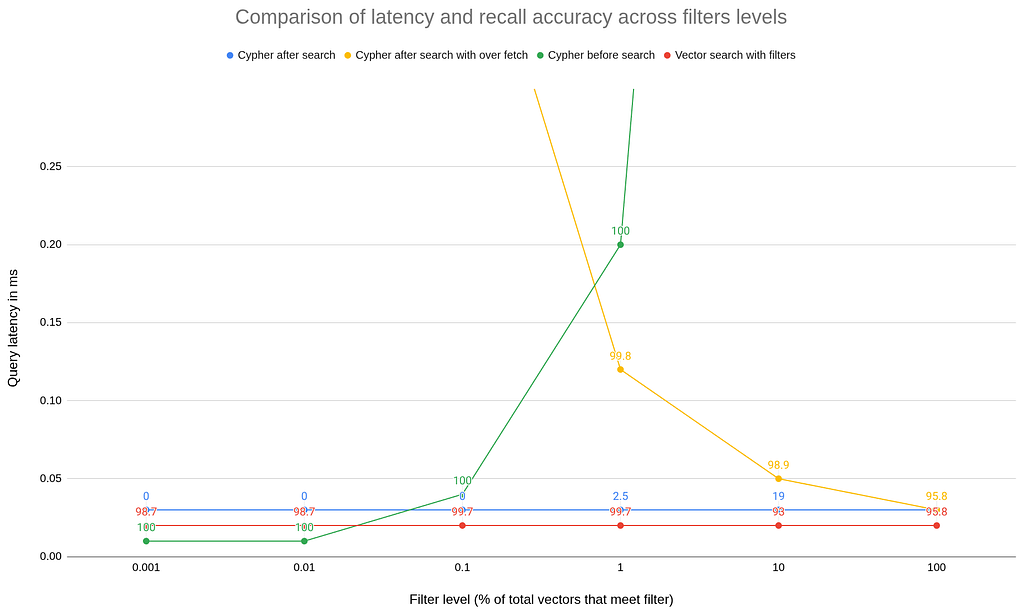 • Cypher after search with over fetch (yellow) by scaling the over fetch to counteract the filter we have a consistent high-90s recall accuracy. But as the filter narrows, our over fetch grows and eventually becomes computationally too costly and latency increases.