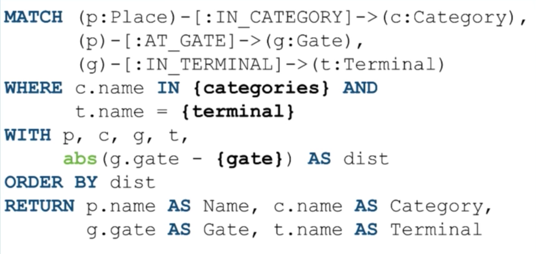 This is going to pull all the places in the category, terminal and gate the user has requested. Then we get the absolute distance of the place to gate where the user is, and return the results in ascending order. Again, a very simple Cypher recommendation to a user based just on their location in the airport.