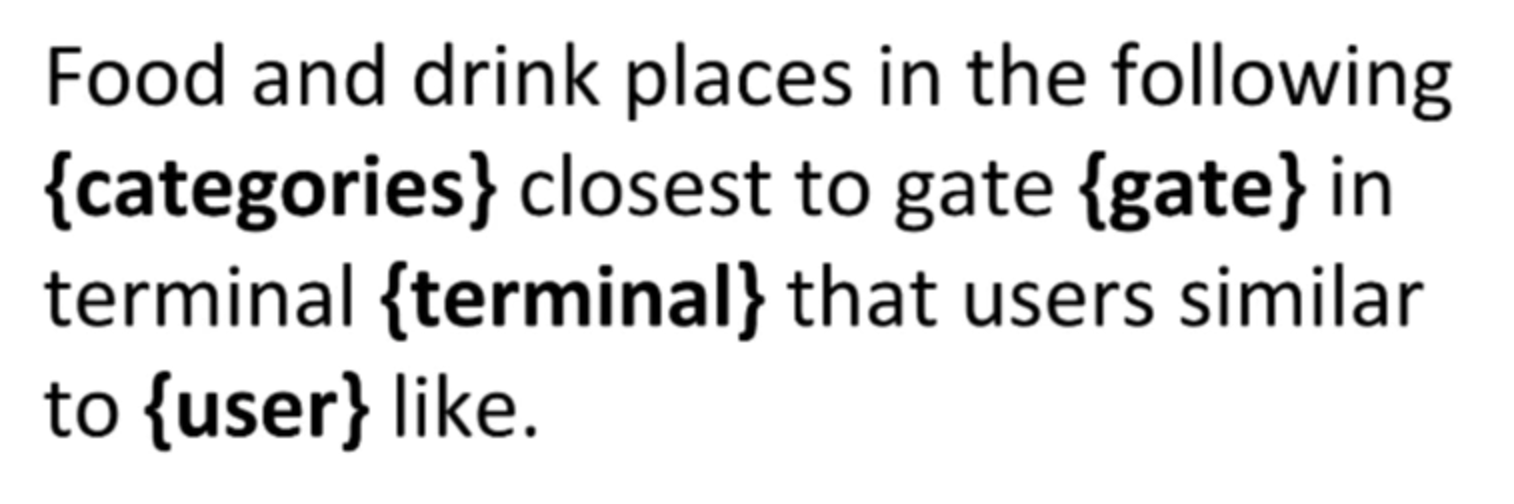 Let’s do a simple recommendation. We want to find a specific type of food in a certain location in the airport, and the curled brackets represent user inputs which are being entered into our hypothetical app: