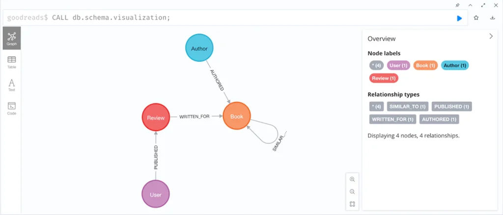 This should show nodes like “Author”, “Book”, “Review” and relationships like “AUTHORED” between Authors and Books as shown below.