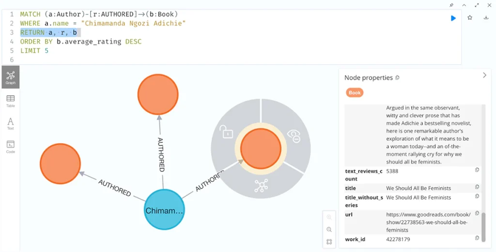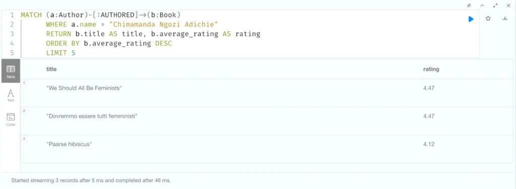 In summary, the Cypher query is: “Find the books authored by Chimamanda Ngozi Adichie, then return their titles and ratings, sorted by rating, and give me the top five.” Cypher efficiently executes this by an index lookup on the author’s name (if an index exists on Author(name)) followed by a traversal to that author’s books. Because Neo4j stores relationships natively, it can fetch connected nodes (the books) in constant time for each author, which is a big reason why graph databases excel at traversal queries.