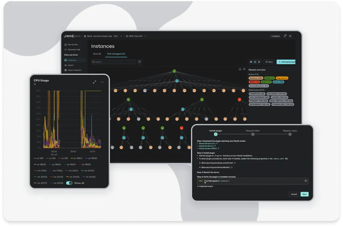 Manage, monitor, and optimize your Neo4j deployments from one control plane — cloud, on-prem, or hybrid. Get real-time visibility, automate operations, and improve performance across environments.